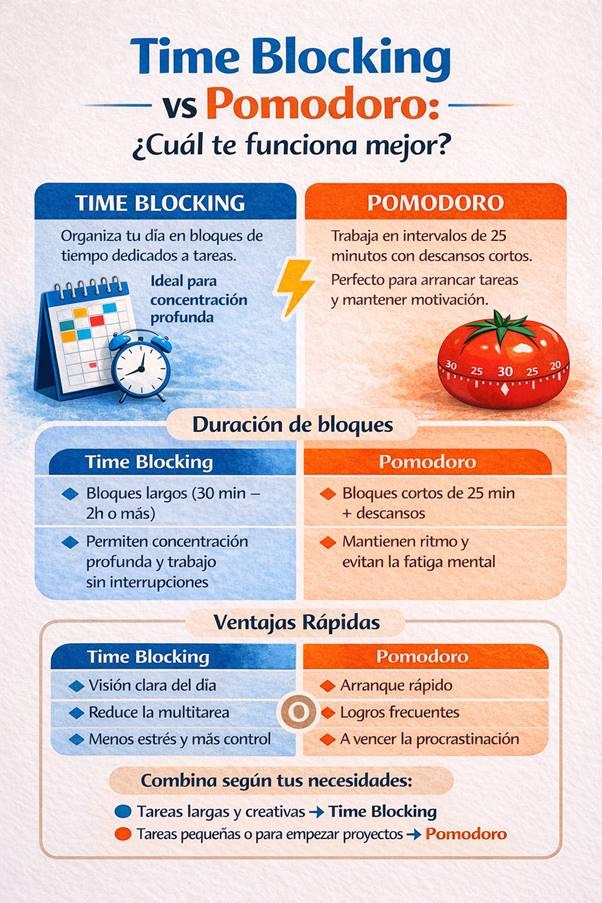 • Pomodoro: Trabalhas em intervalos curtos de 25 minutos, com pequenas pausas pelo meio. É excelente para começar tarefas e evitar a procrastinação, mas, se precisares de concentração prolongada, pode tornar-se insuficiente.