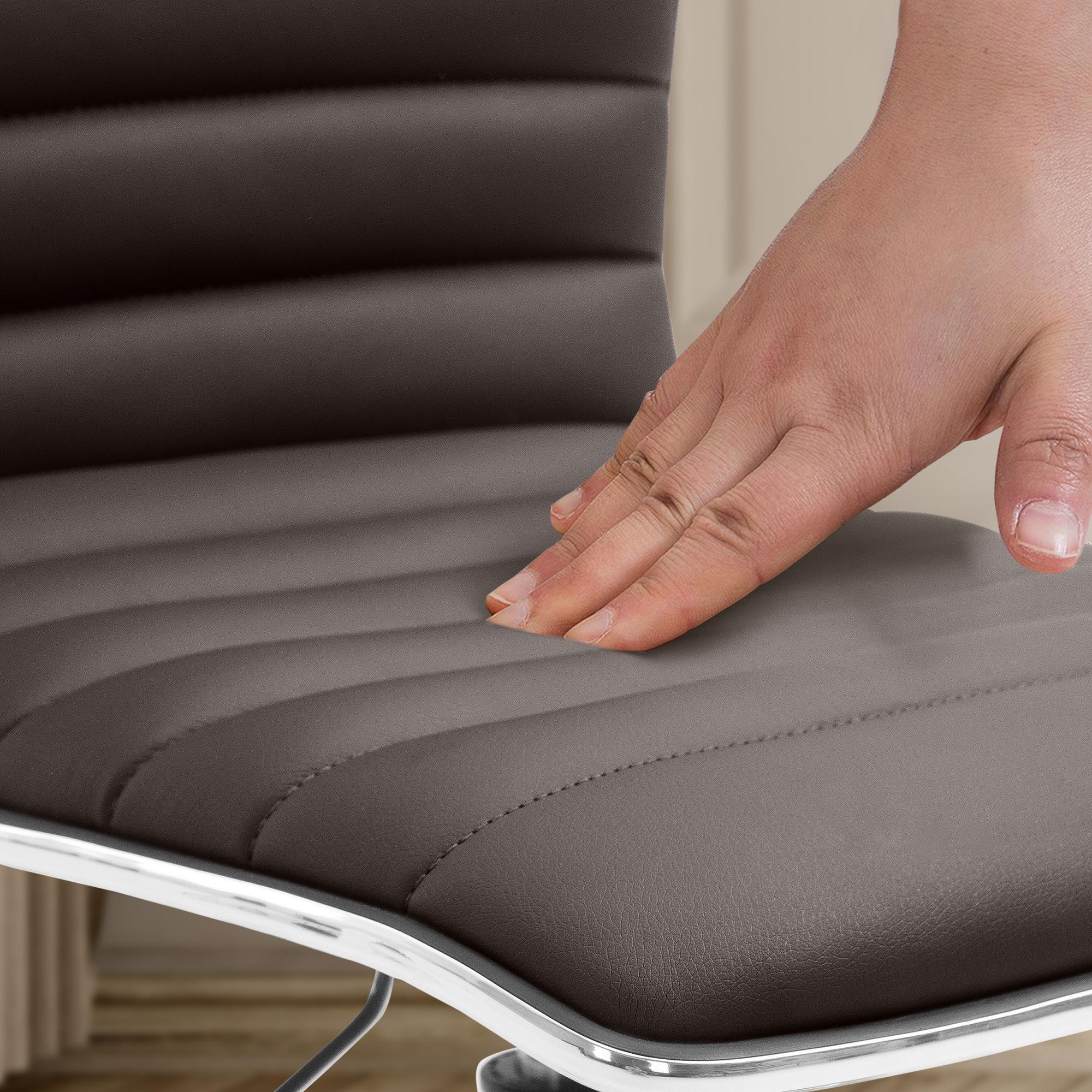 Forrado em pele sintética de alta qualidade, o material macio ao toque é finalizado com costuras visíveis elegantes que conferem um charme único à cadeira. Além de sofisticada, a superfície em pele sintética é fácil de limpar e manter, basta passar um pano húmido para preservar a aparência de novo por muito mais tempo.