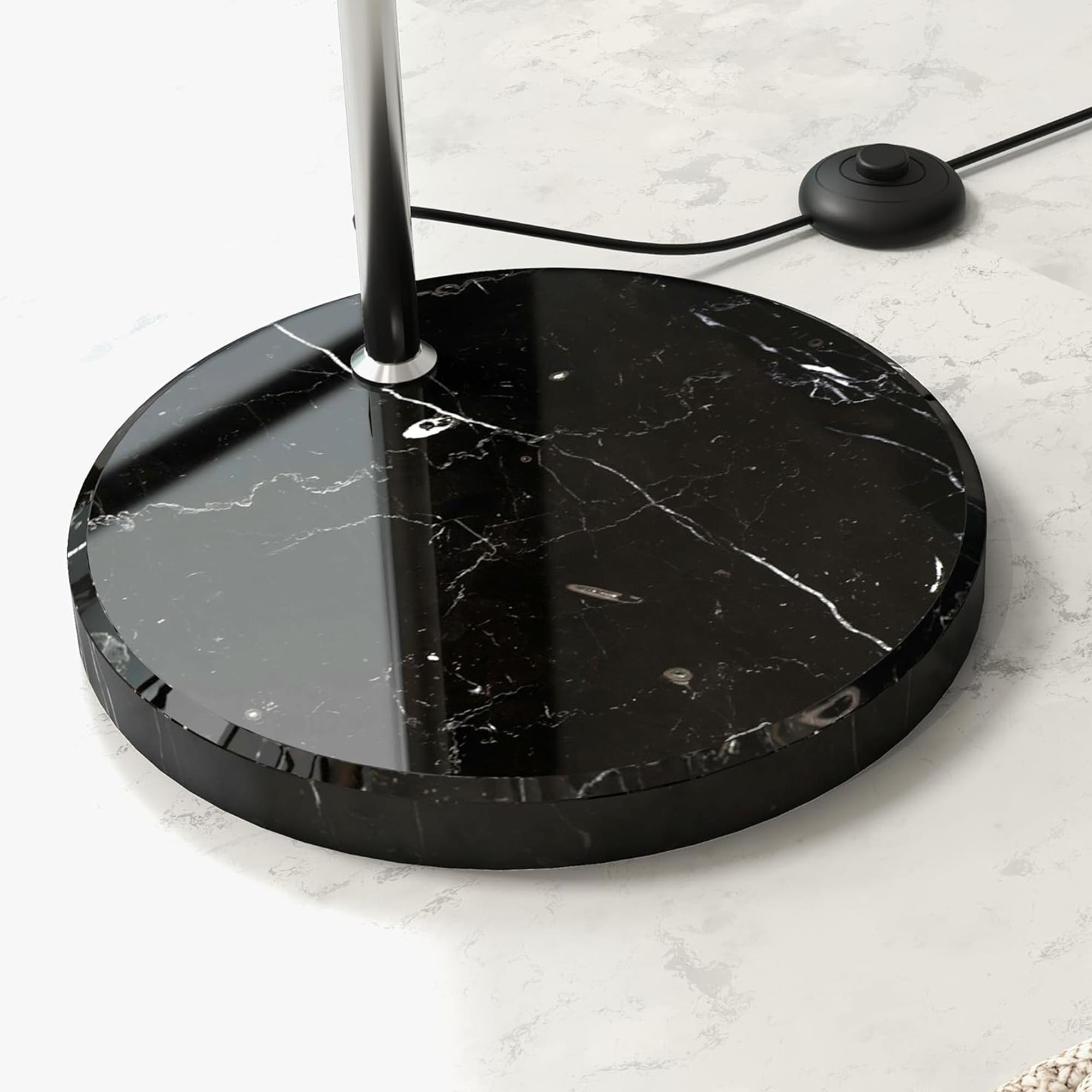 A base redonda é feita de mármore sólido de cor preta com veios, garantindo segurança e estabilidade ao candeeiro. É muito agradável o contraste entre a base escura e a estrutura da haste em cor dourada, que valoriza o ambiente de trabalho e acrescenta um toque retro.