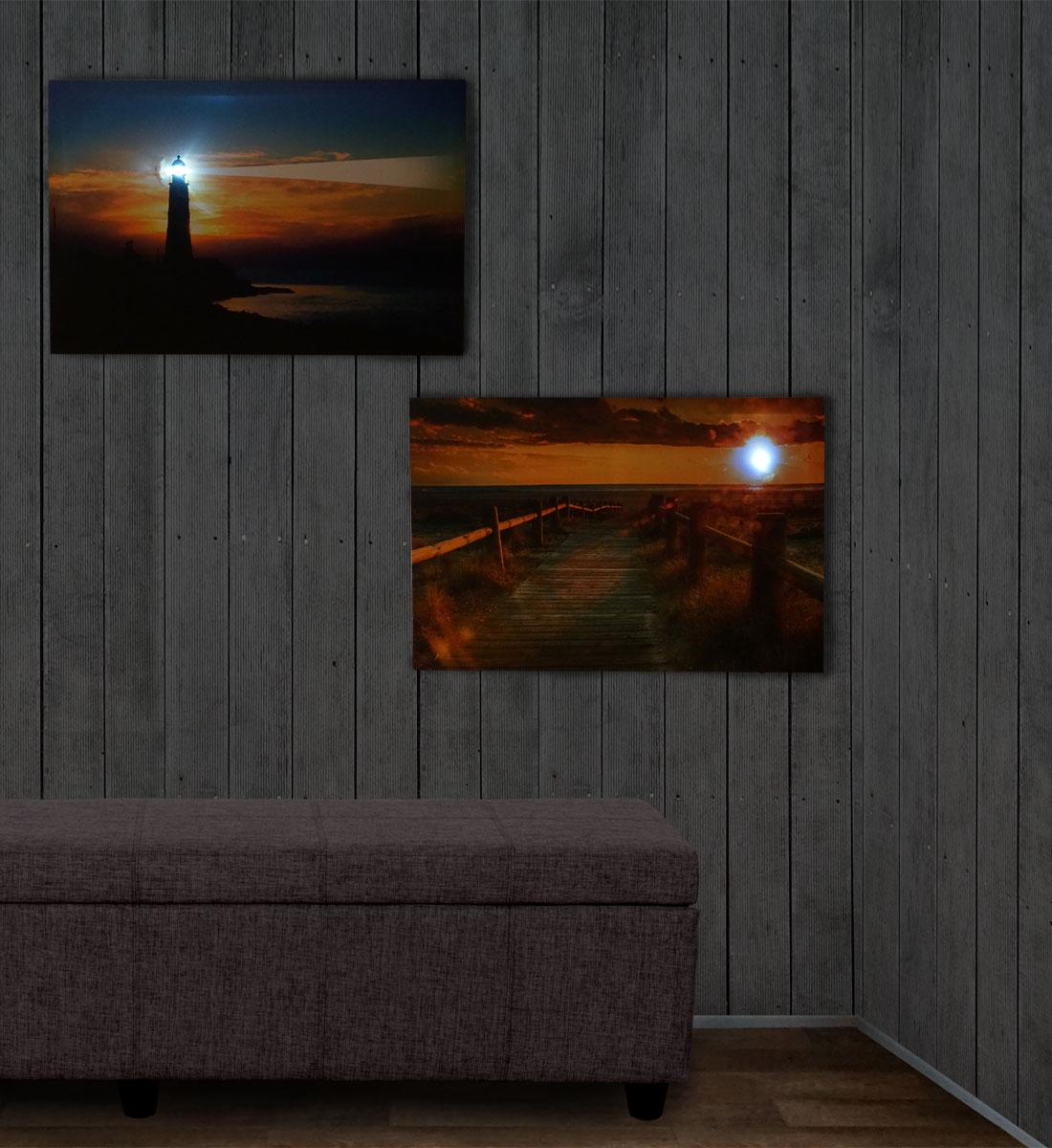 La diferencia de estos cuadros LED con respecto a otros es que se iluminan. Sus luces LED brillan para crear una atmósfera única y diferente. Esas luces (1 en cada cuadro) se alimentan con 2 pilas AA que se esconden en la parte trasera del cuadro, lo que permite que no se vean cables por la pared.