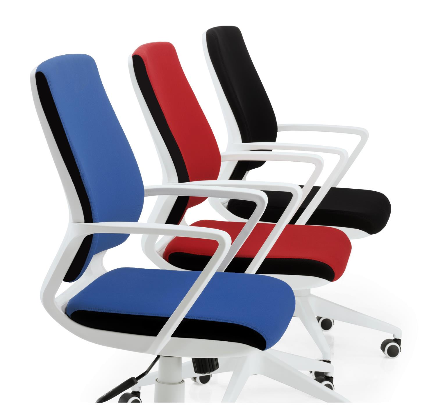 Os apoios de braços são concebidos e perfeitamente integrados na estrutura da cadeira. O mesmo acontece com a base, que também tem um acabamento branco impecável. As rodas revestidas a goma tornam-nas adequadas para todos os tipos de superfícies.
