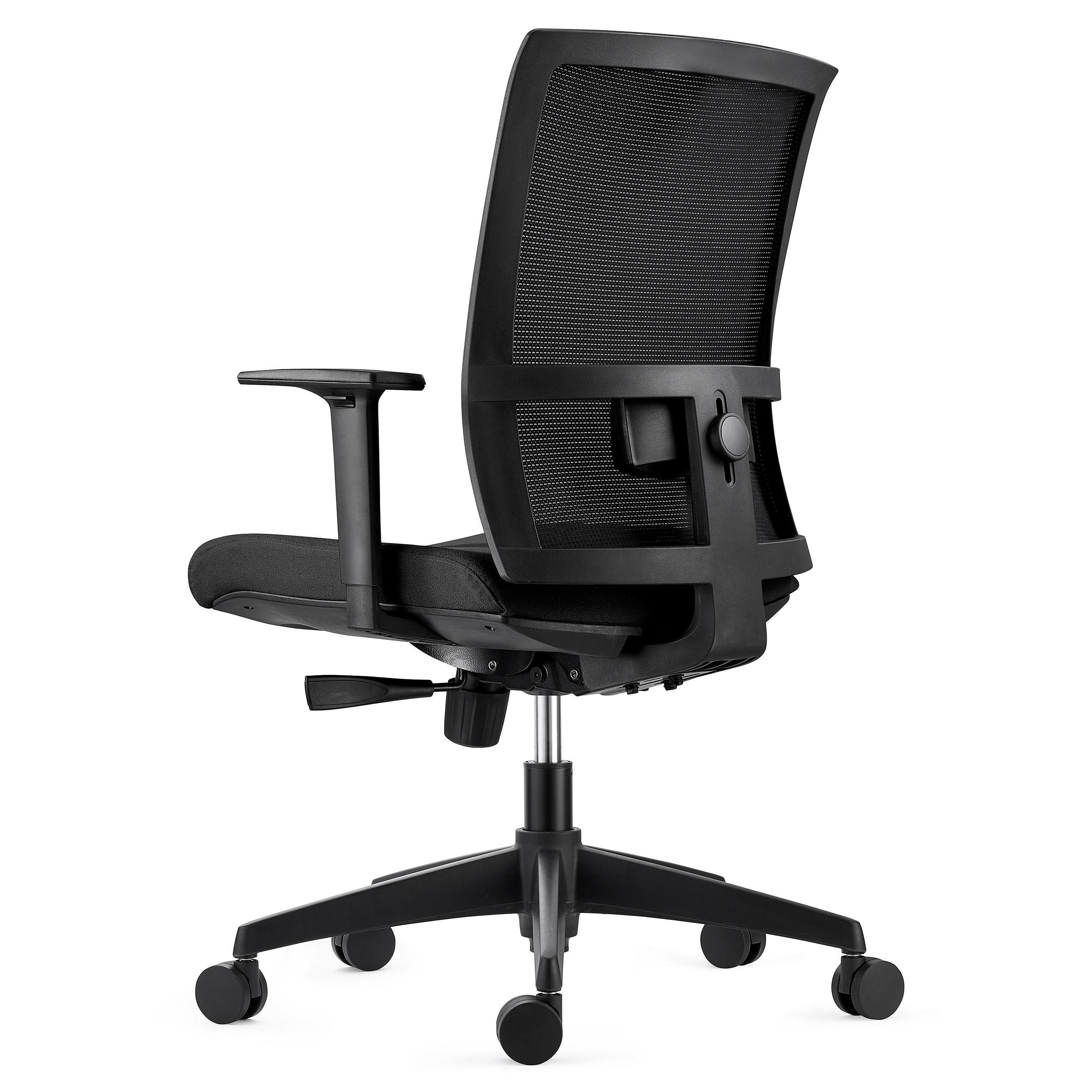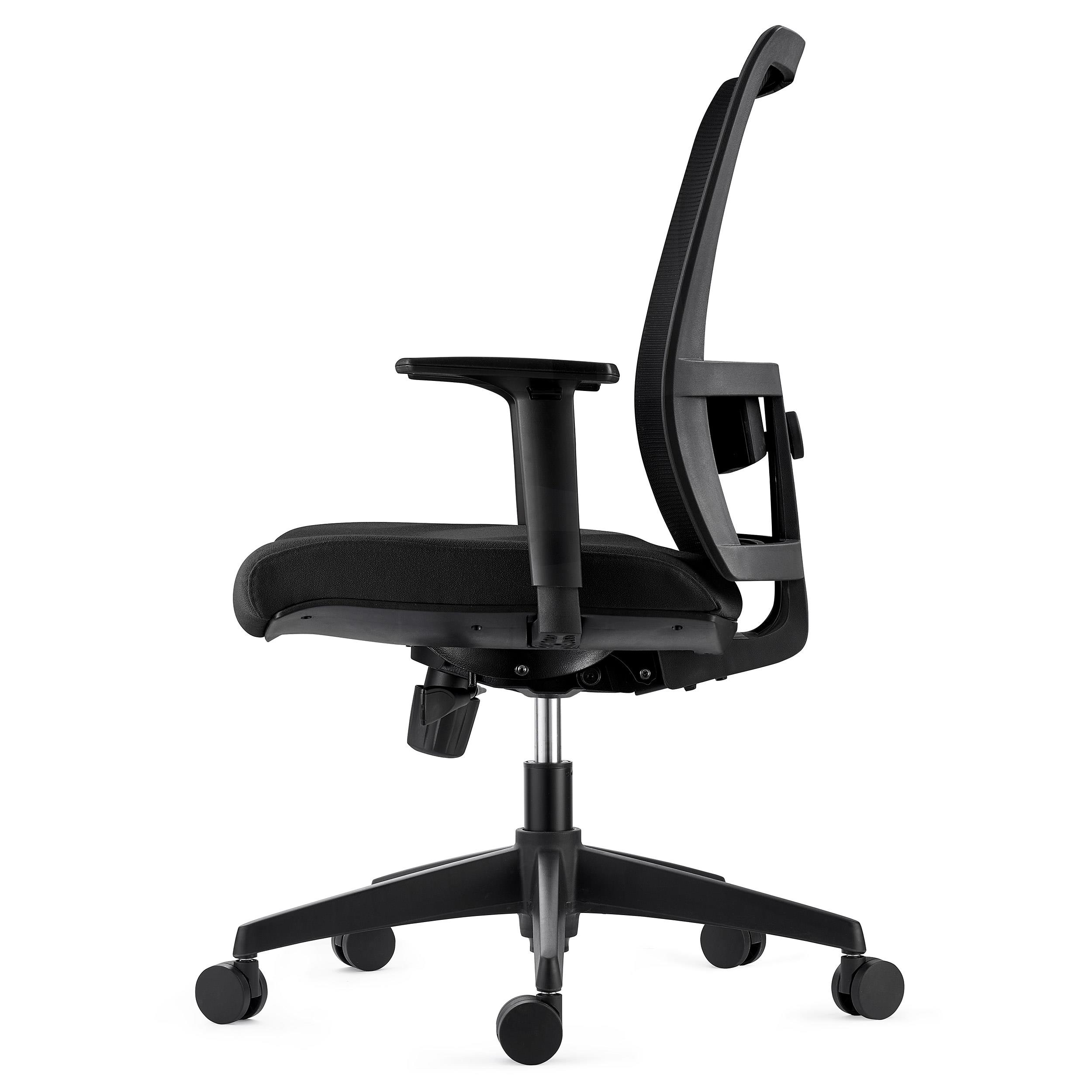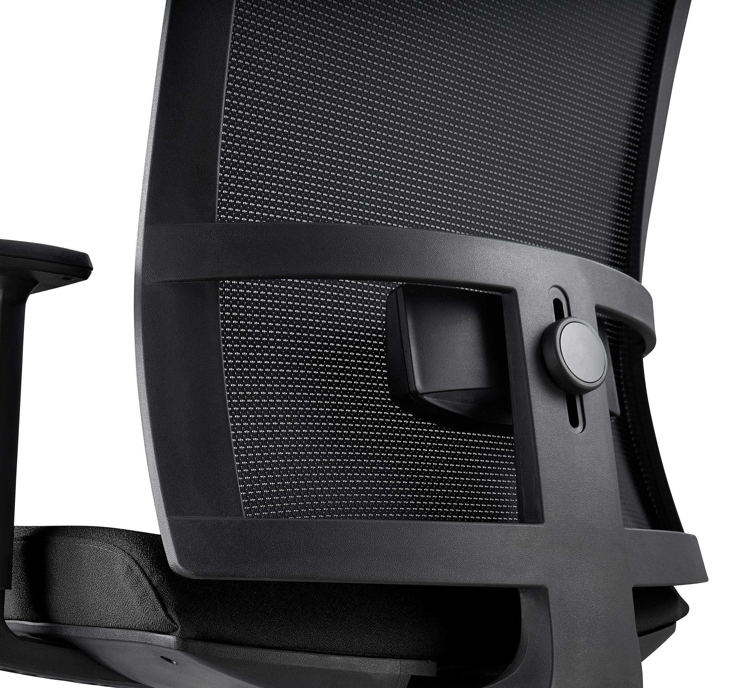 O encosto é fabricado em malha respirável e ergonomicamente adaptável. Inclui suporte lombar ajustável em altura, o que garante ao usuário conforto extra. O seu assento dispõe de um acolchoado flexível de alta densidade 50Kg/m3.