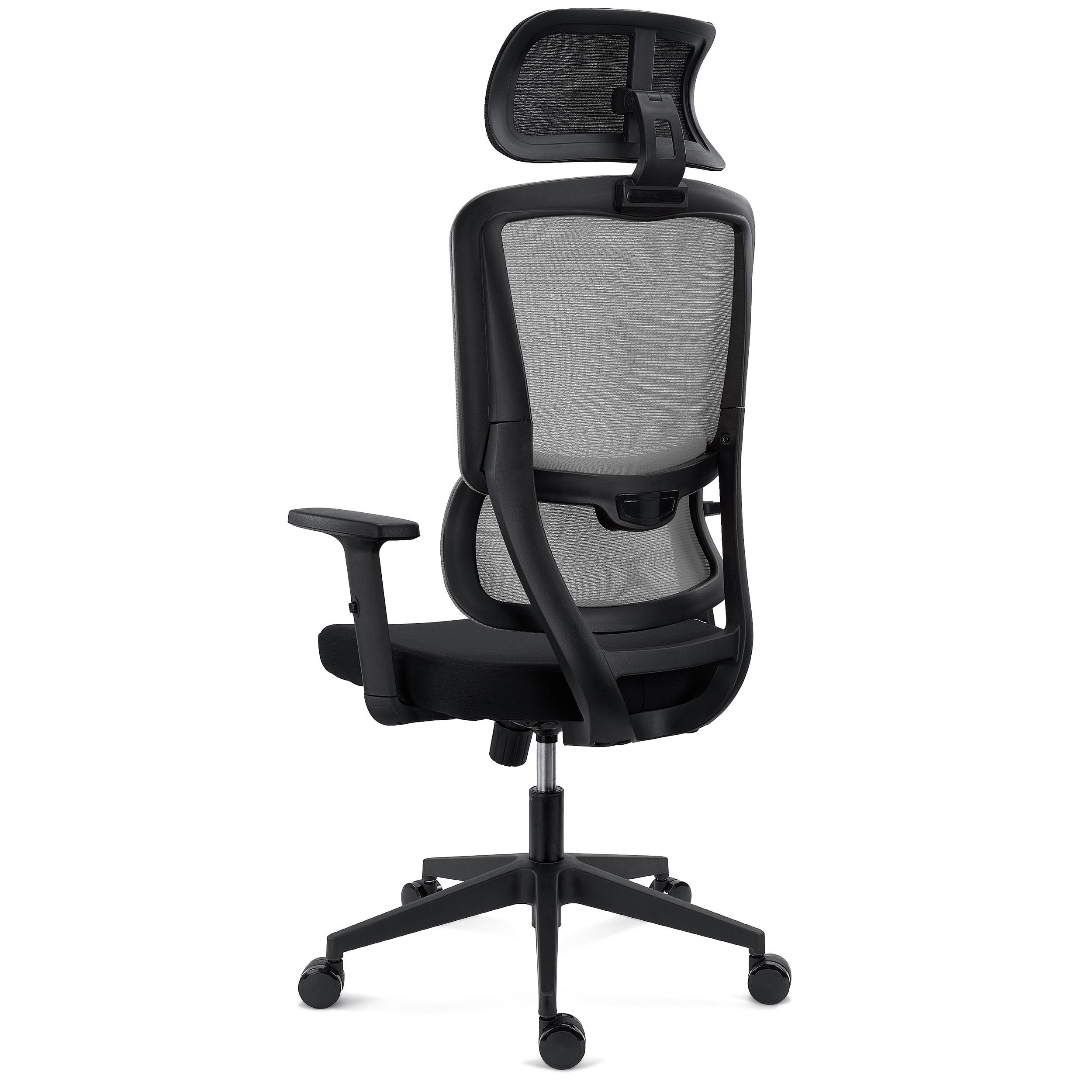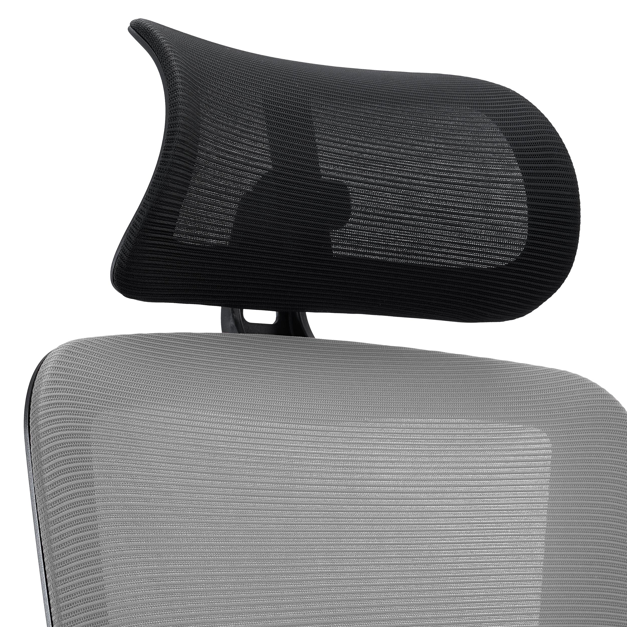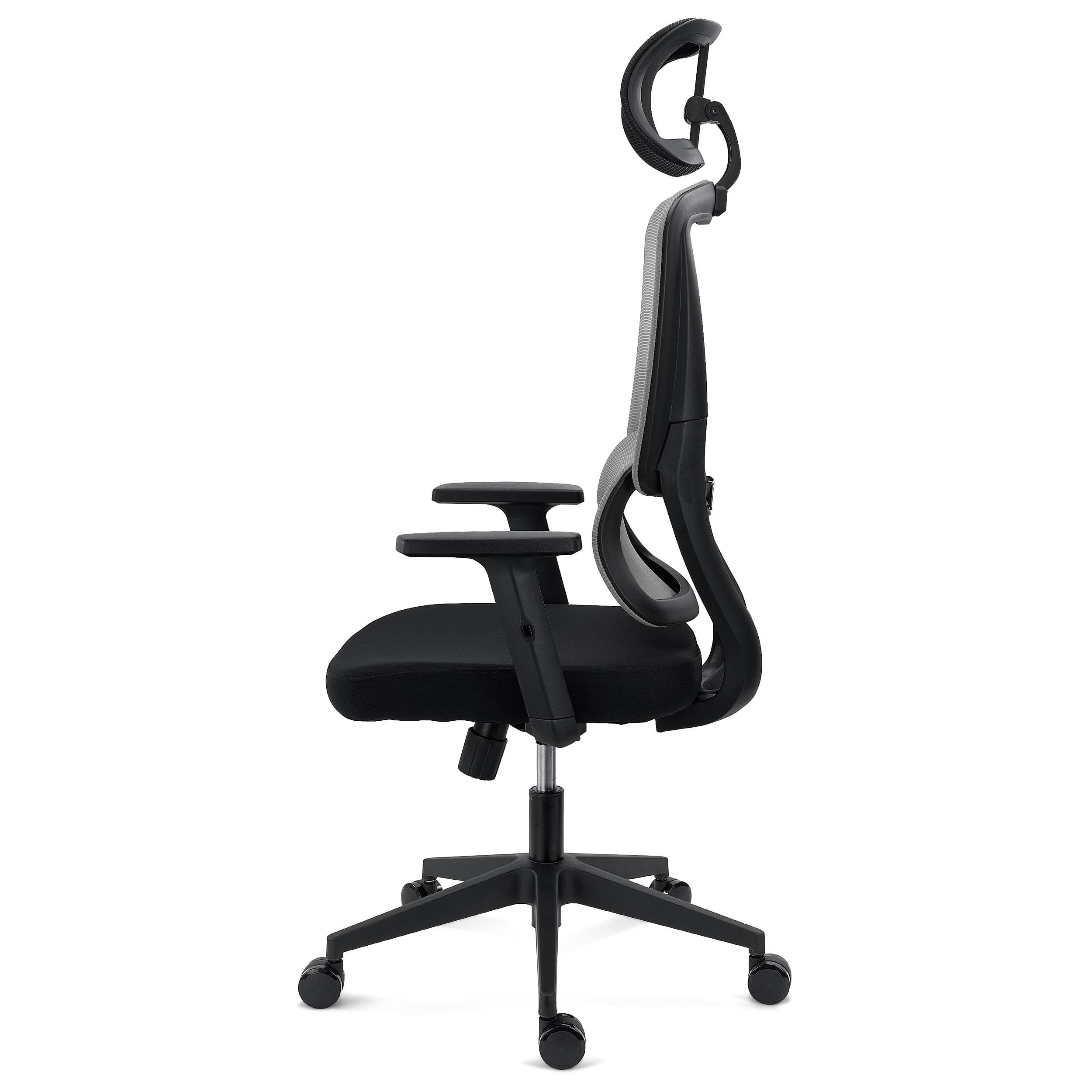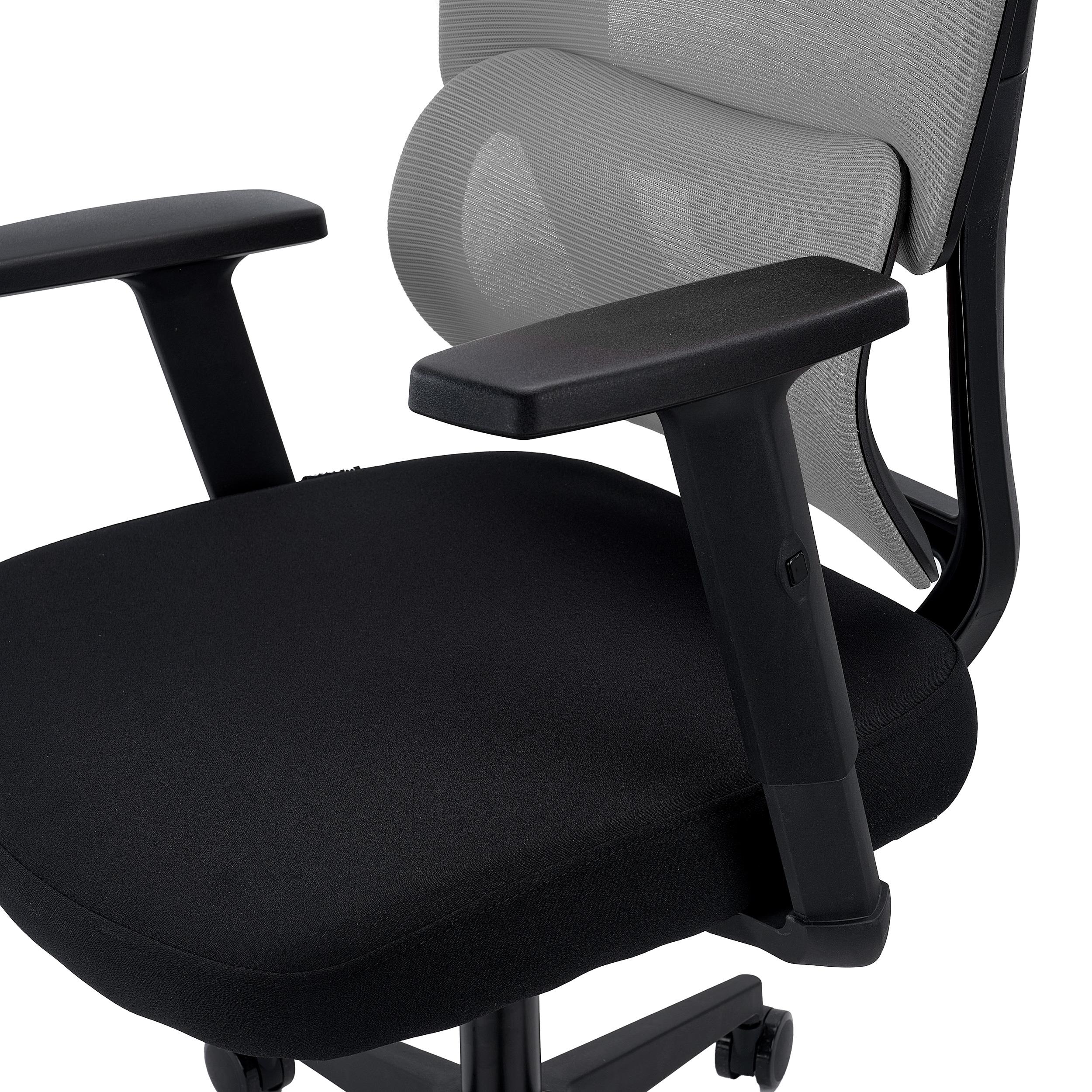 O apoio de braços é ajustável em altura O seu aspeto robusto reforça o conceito de uma cadeira duradoura para uma utilização exigente. O apoio de cabeça é regulável em altura (9 cm de regulação) e em ângulo (até 45º), e é também estofado em malha respirável.
