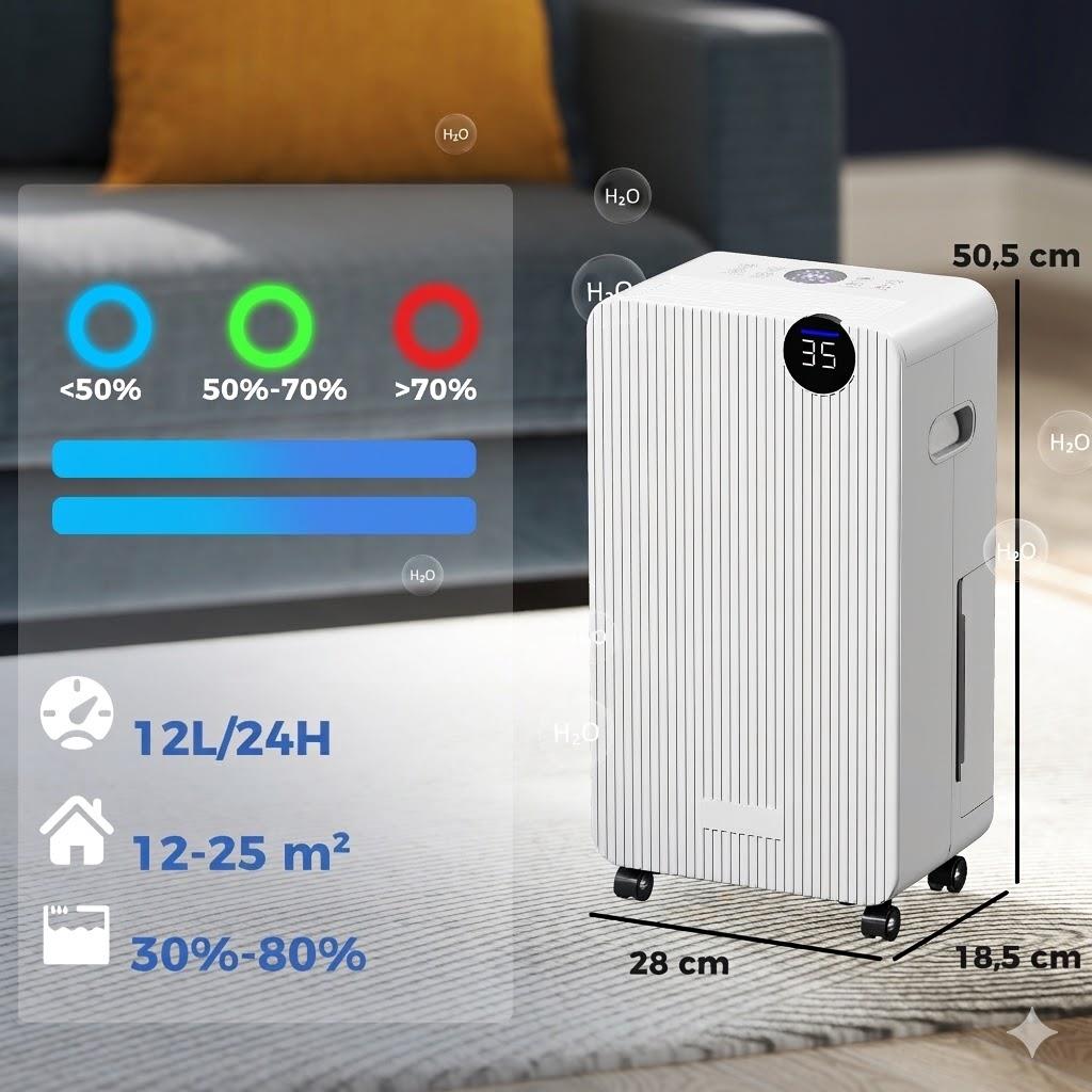 Adequado para áreas entre 12 e 25 m², possui um depósito com capacidade de 2,1 litros e remove até 12 litros de água por dia. Está equipado com um filtro removível e é capaz de movimentar até 100 m³/h de ar, garantindo uma redução eficaz da humidade no ambiente.