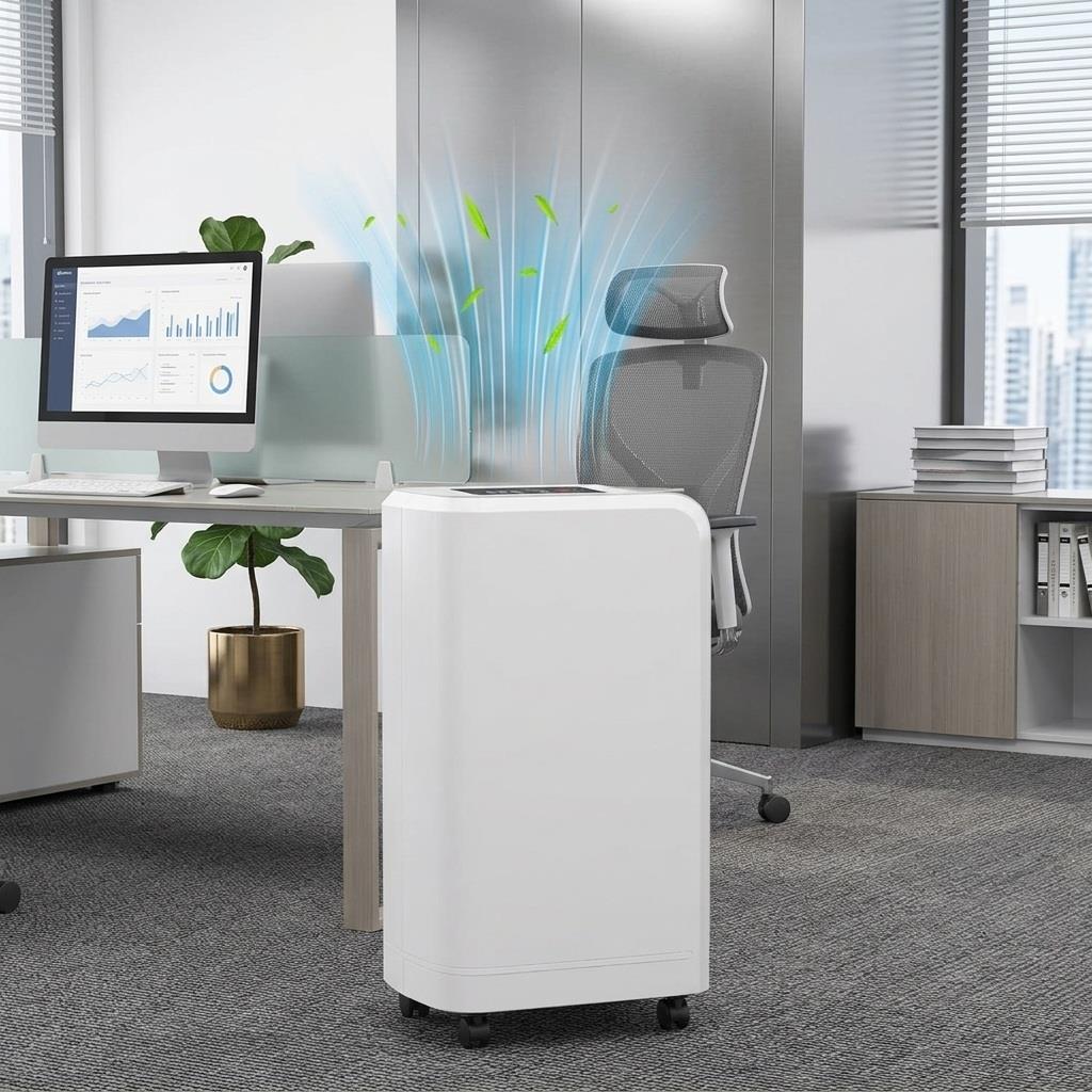 Desumidificador para escritório DRYSMART, um modelo compacto com design essencial, pensado para se integrar perfeitamente em qualquer ambiente de trabalho. Elimina o excesso de humidade e previne a formação de condensação, garantindo um ar sempre fresco e saudável durante o trabalho. Graças às suas dimensões reduzidas, ocupa pouco espaço e oferece elevada eficiência energética.