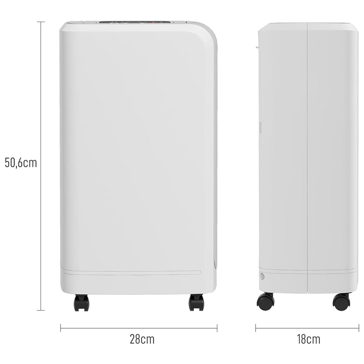 Este desumidificador é adequado para áreas de 13 a 18 m², possui um depósito de 0,8 litros e é capaz de remover até 12 litros de água por dia. Está equipado com um filtro removível e lavável, assegurando uma manutenção simples e prática.