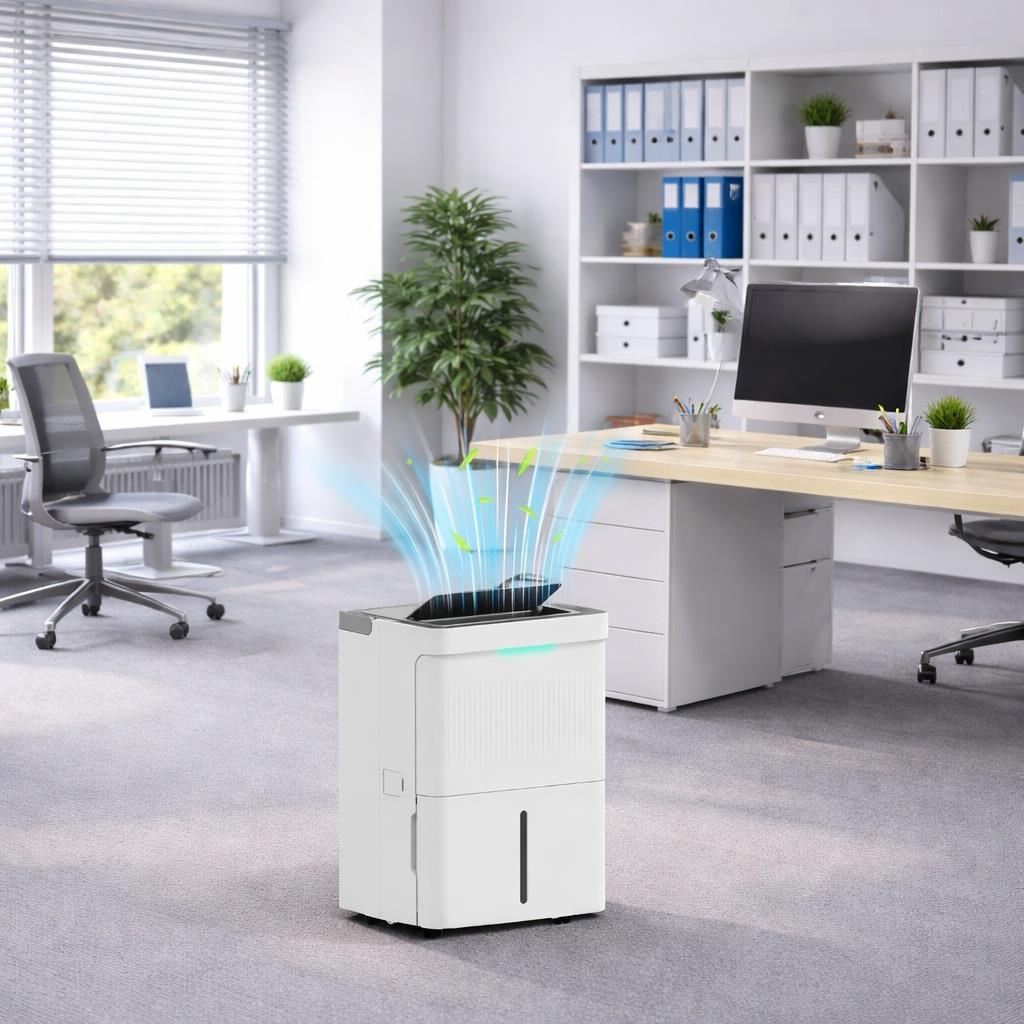 Desumidificador para escritório OFFIDRY, um modelo concebido para eliminar o excesso de humidade. Graças ao seu design compacto e silencioso, integra-se facilmente em qualquer escritório sem perturbar a concentração, garantindo um ar sempre fresco e limpo. É a solução ideal para proteger equipamentos eletrónicos e documentos de arquivo.