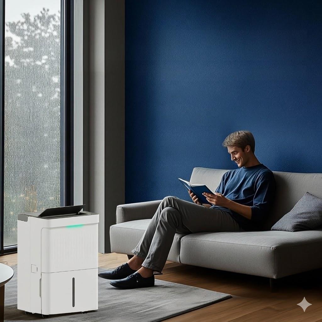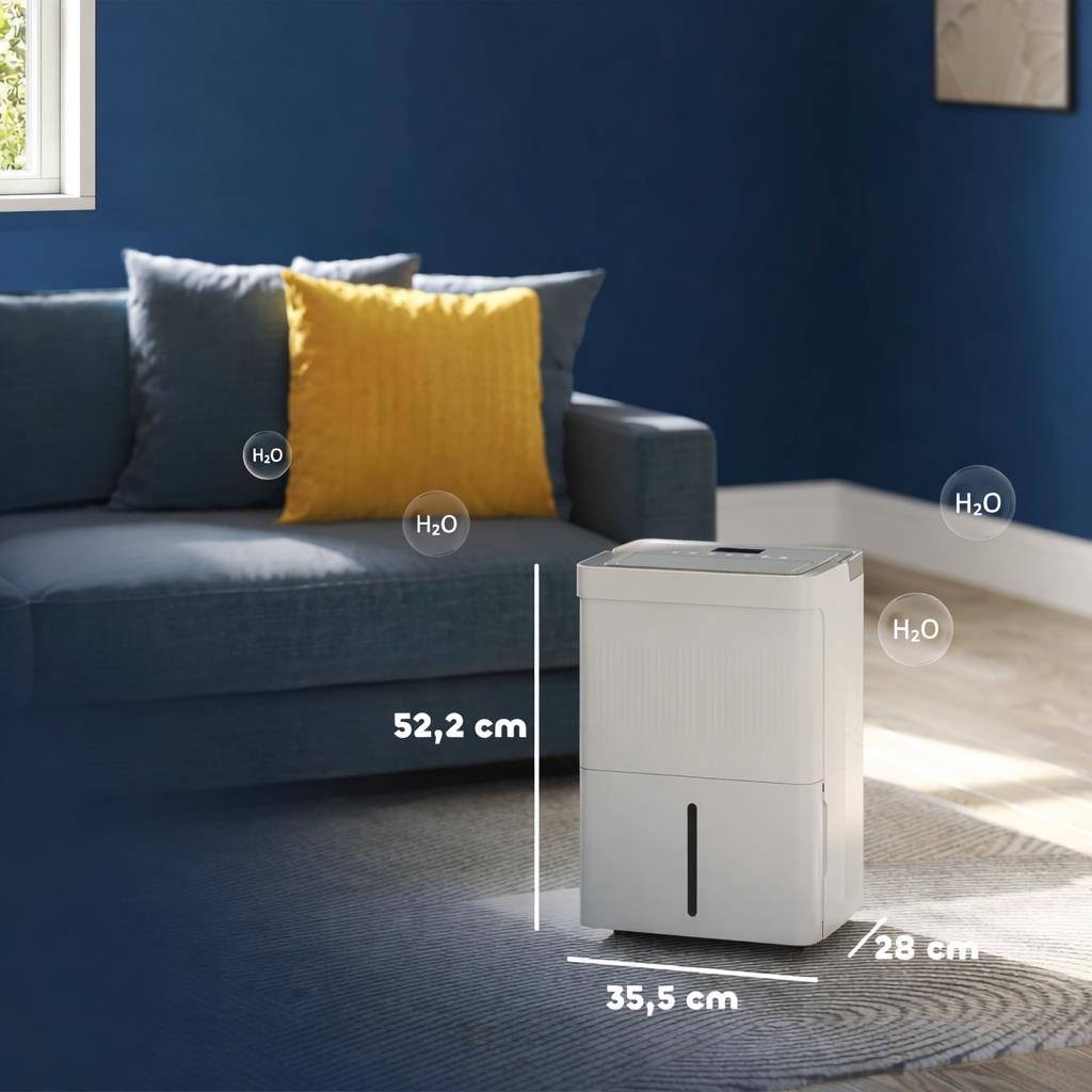 Este desumidificador é adequado para áreas amplas, entre 40 e 100 m², dispõe de um depósito de 5,5 litros e remove até 35 litros de água por dia. Está equipado com um filtro amovível e consegue movimentar até 250 m³/h de ar, assegurando uma redução rápida da humidade no ambiente.