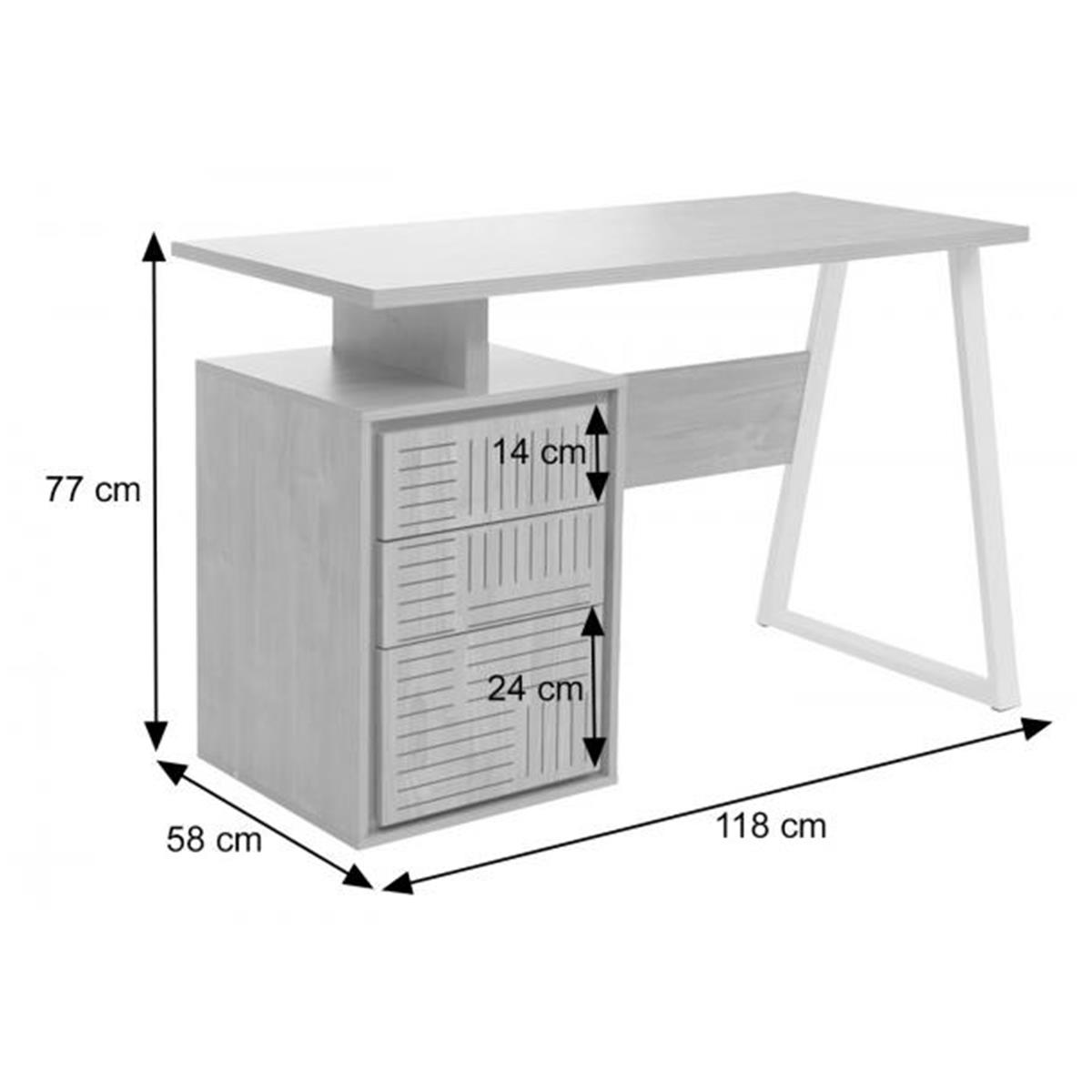Relativamente à funcionalidade, esta mesa possui uma ampla área de trabalho de 118 cm de largura e 58 cm de profundidade, oferecendo o espaço perfeito para realizar as tuas tarefas comodamente. Inclusive, possui 3 gavetas com sistema de abertura por pressão, que permite um acesso fácil, para armazenar de forma ordenada documentos, equipamentos de escritório ou dispositivos eletrónicos.