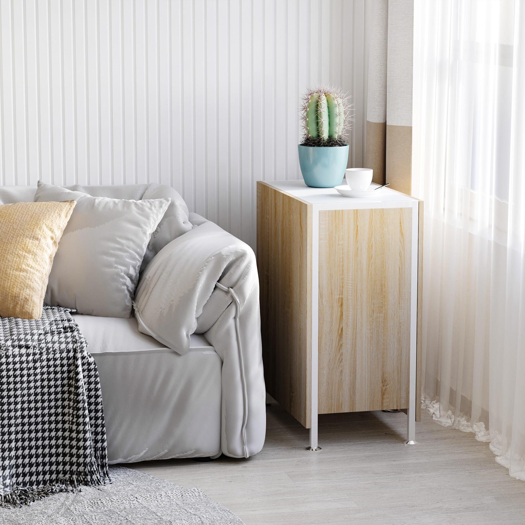 Esta mesa é dobrável de um lado ou de ambos e pode assumir três formatos diferentes. No centro, dispõe ainda de quatro compartimentos em forma de cubo, ideais para armazenar arquivos ou acessórios de escritório, permitindo também utilizar a mesa como móvel de arrumação adicional.