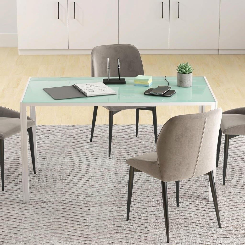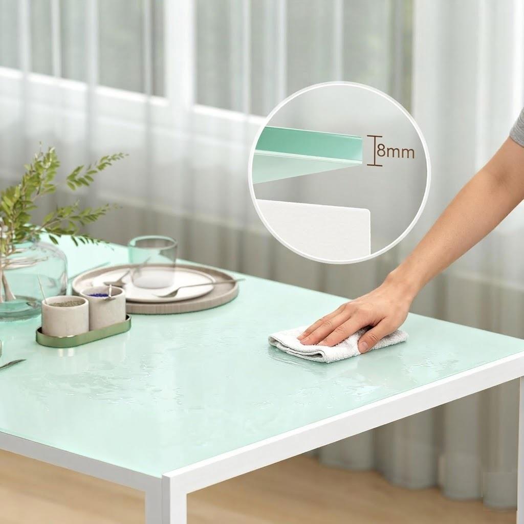 O tampo em vidro, além de esteticamente refinado, é resistente e seguro graças ao processo de têmpera. Isto garante maior robustez em comparação com o vidro comum, tornando-o adequado para o uso diário em ambientes de trabalho intensivos, onde é essencial unir estilo e funcionalidade.
