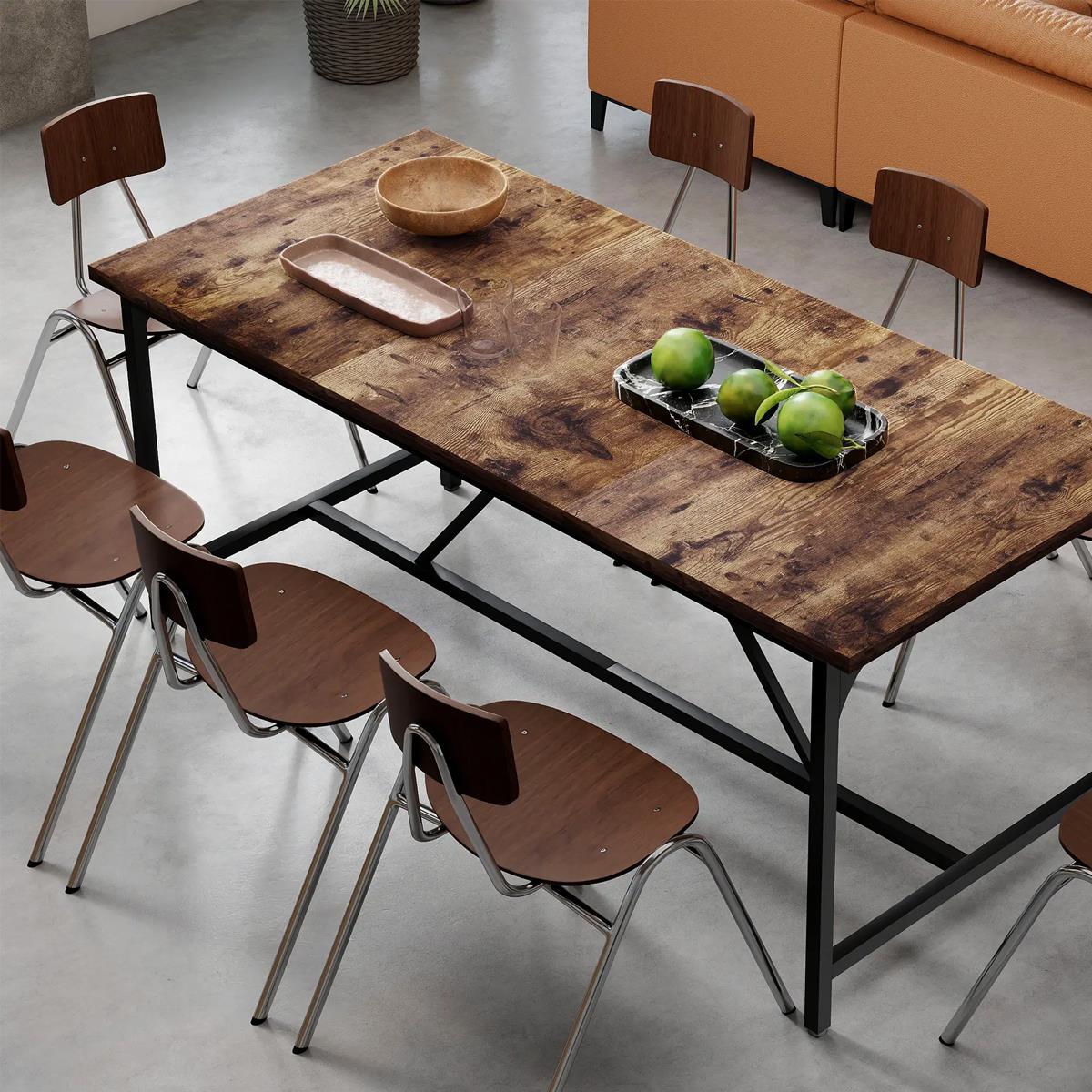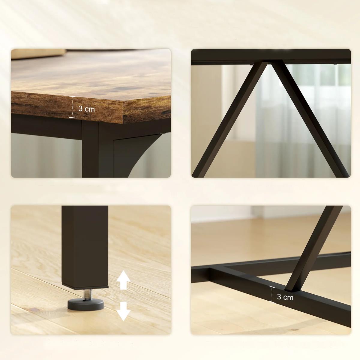 O tampo, em madeira com acabamento de efeito envelhecido e veios naturais, com 3 cm de espessura, confere calor ao ambiente e cria um autêntico estilo industrial. Graças às suas dimensões generosas, oferece amplo espaço para portáteis, documentos e acessórios de trabalho, promovendo a colaboração e a produtividade durante reuniões e sessões de brainstorming.