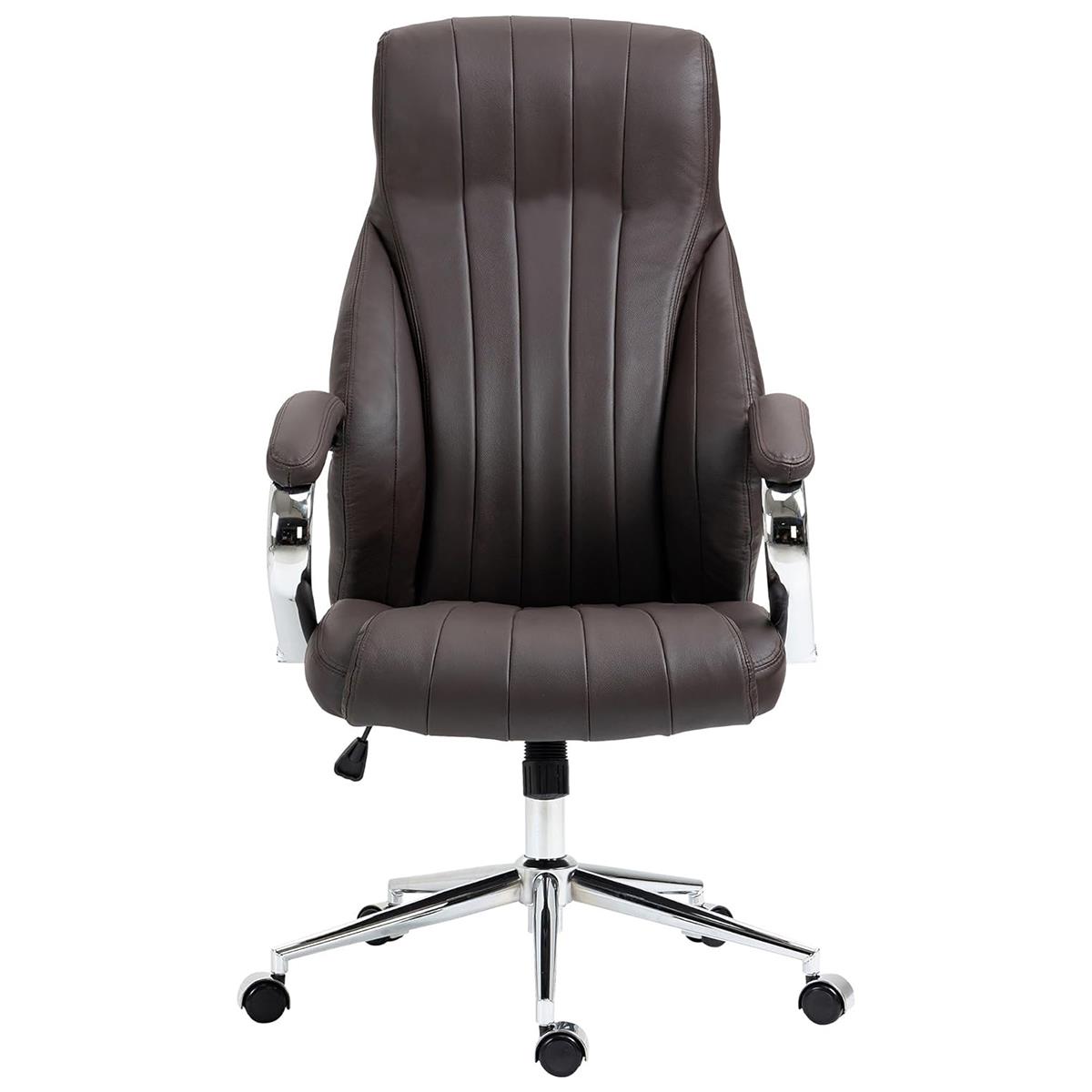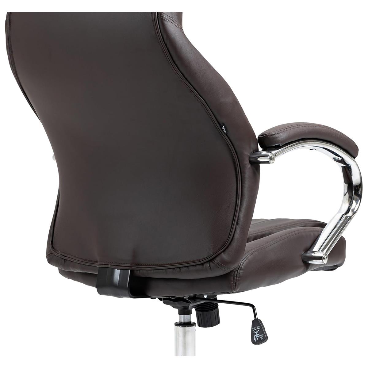 O seu encosto alto e ergonómico garante suporte adequado para toda a coluna, promovendo uma postura correta mesmo após várias horas de uso. A curvatura do encosto foi desenhada para acompanhar a anatomia das costas, enquanto o generoso acolchoado, presente tanto no assento quanto no encosto, proporciona uma experiência de conforto superior. As costuras visíveis ao longo do revestimento não apenas reforçam a estrutura, como também acrescentam um acabamento de luxo ao visual da poltrona.