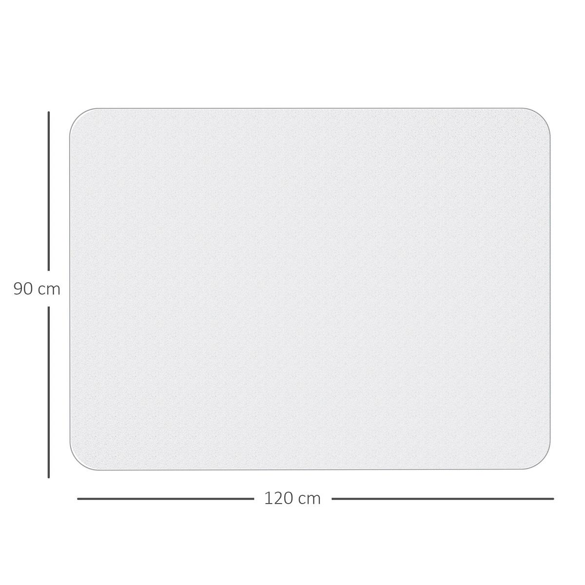 O tapete protetor tem dimensões totais de 90 × 120 cm e é fabricado em PVC, um material que garante fácil manutenção e limpeza.